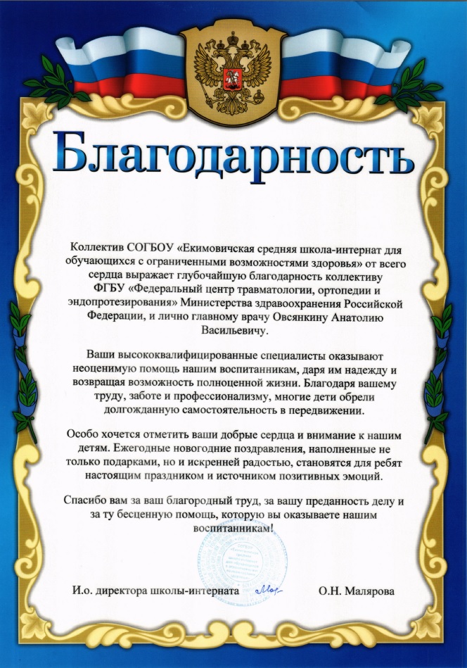 ФГБУ «ФЦТОЭ» МЗ РФ (г. Смоленск)- давний партнер этой школы. От лица главного врача А.В.Овсянкина были переданы поздравления и необходимый для школы подарок – принтер.